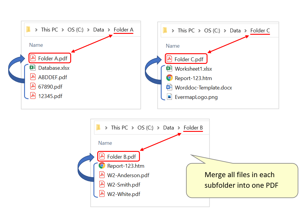 Here, the contents of each subfolder have been merged into one PDF. Each document has been placed in the corresponding folder, and named after it: