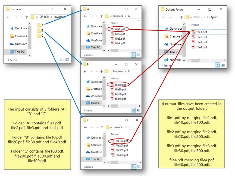 Unlike regular document merging, there are multiple output files from this operation. Each output file is created by taking one file from each input folder and merging them together. Files are merged based on file names. For each file in the first input folder, there is one output file (with the same name) created in the output folder. Documents are combined by searching for the most similar file names in each input folder and appending them to the output file. Each file name is compared to the name of the current output file and the file name with the longest match is used. This method can be used to assemble multiple personalized documents (for example, montly statements) from multiple sub-documents. The user can control the minimim required similarity between file names.