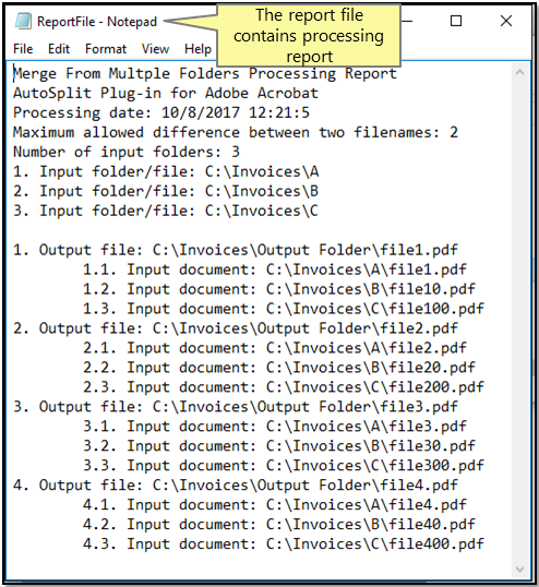The software automatically created "Merge From Multiple Folders Processing Report.txt" file and "Merge Documents From Multiple Folders Cover Page".PDF files. The processing report lists input files used to create each output files as well as shows input folders and similiarity parameter used.