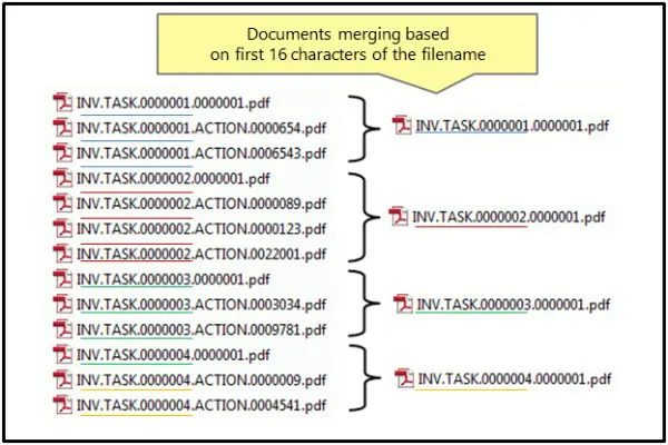Unlike regular document merging, there are multiple output files from this operation. Each output file is created by taking one input document and finding all other documents that have at least X common first characters in the file name. The similarity between two file names are controlled by a user-specified number of common characters. All merged documents are placed in the user-selected output folder. Merged files have the same name as a first file in group used for merging.