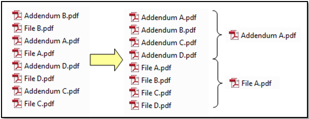 Files are sorted alphabetically prior to merging. The order of the files in the merged document(s) depends on the document names. The names of the output documents depend on what file name appears first in the sorted list of input files. Here is an example of merging 8 files into 2 output PDF documents: