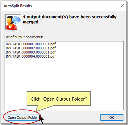 The “AutoSplit Results” dialog appears on screen once processing is completed. It shows a list of output documents.